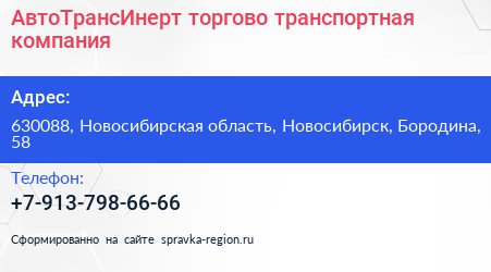 АвтоТрансИнерт, торгово-транспортная компания по адресу 630088, Новосибирская область, Новосибирск, Бородина, 58 в дальнейшем Организация, размещена в следующих категориях: