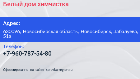 Белый дом, химчистка по адресу 630096, Новосибирская область, Новосибирск, Забалуева, 51а в дальнейшем Организация, размещена в следующих категориях: