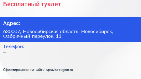 Бесплатный туалет по адресу 630007, Новосибирская область, Новосибирск, Фабричный переулок, 11 в дальнейшем Организация, размещена в следующих категориях:
