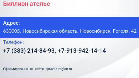 Биллион, ателье по адресу 630005, Новосибирская область, Новосибирск, Гоголя, 42 в дальнейшем Организация, размещена в следующих категориях: