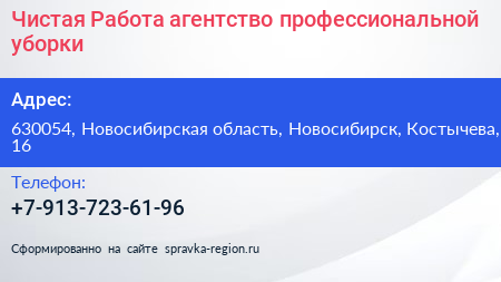 Чистая Работа, агентство профессиональной уборки по адресу 630054, Новосибирская область, Новосибирск, Костычева, 16 в дальнейшем Организация, размещена в следующих категориях: