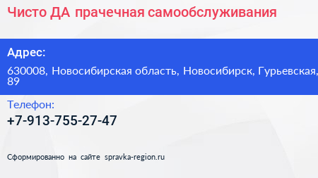 Чисто-ДА!, прачечная самообслуживания по адресу 630008, Новосибирская область, Новосибирск, Гурьевская, 89 в дальнейшем Организация, размещена в следующих категориях: