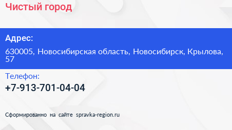 Чистый город по адресу 630005, Новосибирская область, Новосибирск, Крылова, 57 в дальнейшем Организация, размещена в следующих категориях: