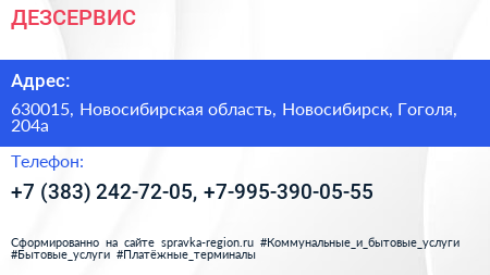 ДЕЗСЕРВИС по адресу 630015, Новосибирская область, Новосибирск, Гоголя, 204а в дальнейшем Организация, размещена в следующих категориях:
