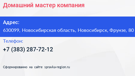 Домашний мастер, компания по адресу 630099, Новосибирская область, Новосибирск, Фрунзе, 80 в дальнейшем Организация, размещена в следующих категориях: