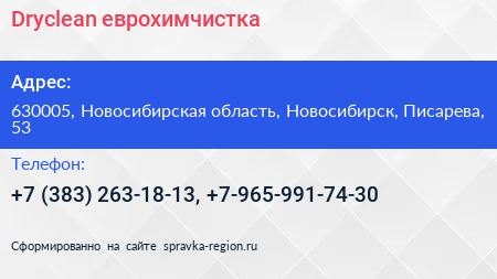 Dryclean, еврохимчистка по адресу 630005, Новосибирская область, Новосибирск, Писарева, 53 в дальнейшем Организация, размещена в следующих категориях: