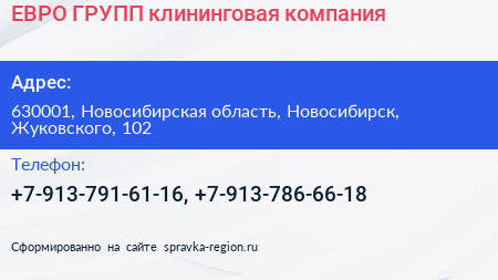 ЕВРО-ГРУПП, клининговая компания по адресу 630001, Новосибирская область, Новосибирск, Жуковского, 102 в дальнейшем Организация, размещена в следующих категориях:
