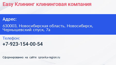 Easy Клининг, клининговая компания по адресу 630003, Новосибирская область, Новосибирск, Чернышевский спуск, 7а в дальнейшем Организация, размещена в следующих категориях:
