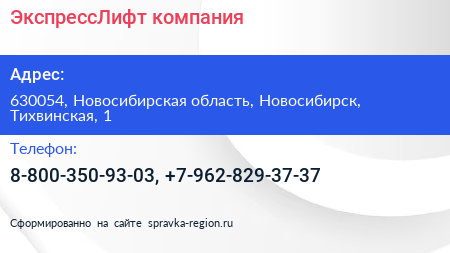 ЭкспрессЛифт, компания по адресу 630054, Новосибирская область, Новосибирск, Тихвинская, 1 в дальнейшем Организация, размещена в следующих категориях: