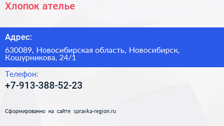 Хлопок, ателье по адресу 630089, Новосибирская область, Новосибирск, Кошурникова, 24/1 в дальнейшем Организация, размещена в следующих категориях: