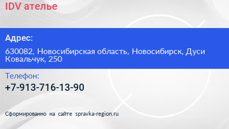 IDV, ателье по адресу 630082, Новосибирская область, Новосибирск, Дуси Ковальчук, 250 в дальнейшем Организация, размещена в следующих категориях: