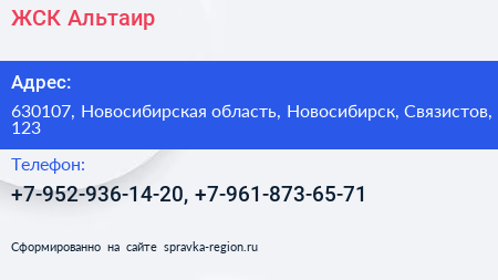 ЖСК Альтаир по адресу 630107, Новосибирская область, Новосибирск, Связистов, 123 в дальнейшем Организация, размещена в следующих категориях: