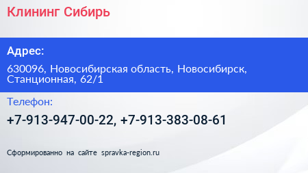 Клининг-Сибирь по адресу 630096, Новосибирская область, Новосибирск, Станционная, 62/1 в дальнейшем Организация, размещена в следующих категориях: