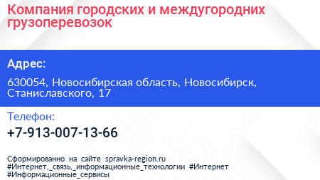 Компания городских и междугородних грузоперевозок по адресу 630054, Новосибирская область, Новосибирск, Станиславского, 17 в дальнейшем Организация, размещена в следующих категориях: