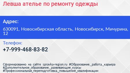 Левша, ателье по ремонту одежды по адресу 630091, Новосибирская область, Новосибирск, Мичурина, 12 в дальнейшем Организация, размещена в следующих категориях: