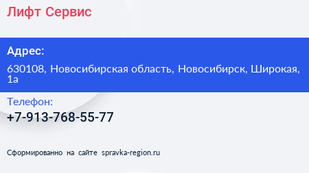 Лифт Сервис по адресу 630108, Новосибирская область, Новосибирск, Широкая, 1а в дальнейшем Организация, размещена в следующих категориях: