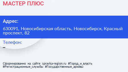 МАСТЕР ПЛЮС по адресу 630091, Новосибирская область, Новосибирск, Красный проспект, 82 в дальнейшем Организация, размещена в следующих категориях: