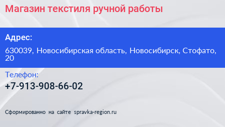Магазин текстиля ручной работы по адресу 630039, Новосибирская область, Новосибирск, Стофато, 20 в дальнейшем Организация, размещена в следующих категориях: