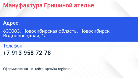 Мануфактура Гришиной, ателье по адресу 630083, Новосибирская область, Новосибирск, Водопроводная, 1а в дальнейшем Организация, размещена в следующих категориях: