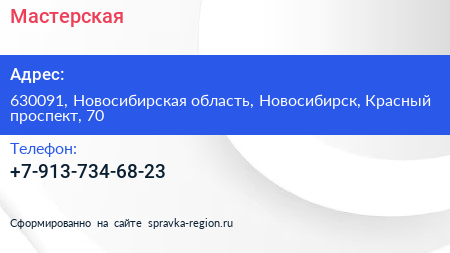 Мастерская по адресу 630091, Новосибирская область, Новосибирск, Красный проспект, 70 в дальнейшем Организация, размещена в следующих категориях: