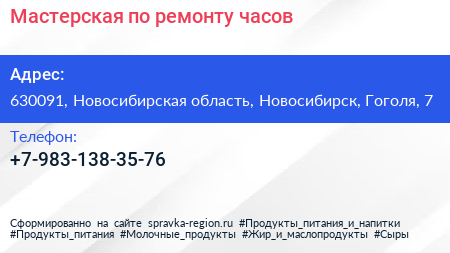 Мастерская по ремонту часов по адресу 630091, Новосибирская область, Новосибирск, Гоголя, 7 в дальнейшем Организация, размещена в следующих категориях: