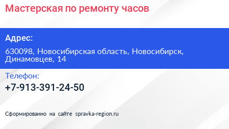 Мастерская по ремонту часов по адресу 630098, Новосибирская область, Новосибирск, Динамовцев, 14 в дальнейшем Организация, размещена в следующих категориях:
