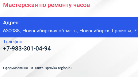 Мастерская по ремонту часов по адресу 630088, Новосибирская область, Новосибирск, Громова, 7 в дальнейшем Организация, размещена в следующих категориях: