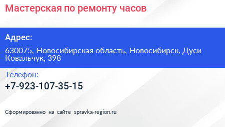 Мастерская по ремонту часов по адресу 630075, Новосибирская область, Новосибирск, Дуси Ковальчук, 398 в дальнейшем Организация, размещена в следующих категориях: