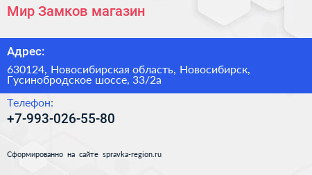 Мир Замков, магазин по адресу 630124, Новосибирская область, Новосибирск, Гусинобродское шоссе, 33/2а в дальнейшем Организация, размещена в следующих категориях: