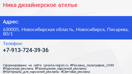 Ника, дизайнерское ателье по адресу 630005, Новосибирская область, Новосибирск, Писарева, 80/1 в дальнейшем Организация, размещена в следующих категориях: