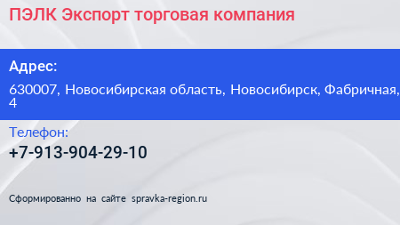 ПЭЛК-Экспорт, торговая компания по адресу 630007, Новосибирская область, Новосибирск, Фабричная, 4 в дальнейшем Организация, размещена в следующих категориях: