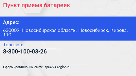 Пункт приема батареек по адресу 630009, Новосибирская область, Новосибирск, Кирова, 110 в дальнейшем Организация, размещена в следующих категориях: