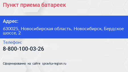 Пункт приема батареек по адресу 630025, Новосибирская область, Новосибирск, Бердское шоссе, 2 в дальнейшем Организация, размещена в следующих категориях: