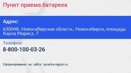 Пункт приема батареек по адресу 630048, Новосибирская область, Новосибирск, площадь Карла Маркса, 7 в дальнейшем Организация, размещена в следующих категориях: