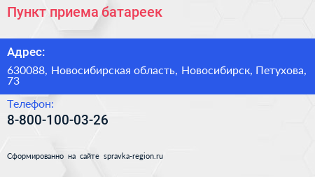 Пункт приема батареек по адресу 630088, Новосибирская область, Новосибирск, Петухова, 73 в дальнейшем Организация, размещена в следующих категориях: