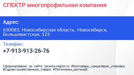 СПЕКТР, многопрофильная компания по адресу 630083, Новосибирская область, Новосибирск, Большевистская, 123 в дальнейшем Организация, размещена в следующих категориях:
