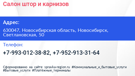 Салон штор и карнизов по адресу 630047, Новосибирская область, Новосибирск, Светлановская, 50 в дальнейшем Организация, размещена в следующих категориях: