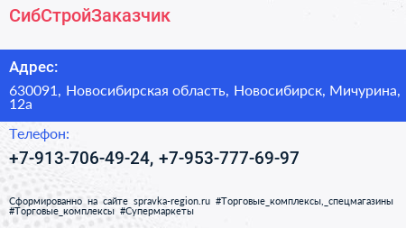 СибСтройЗаказчик по адресу 630091, Новосибирская область, Новосибирск, Мичурина, 12а в дальнейшем Организация, размещена в следующих категориях: