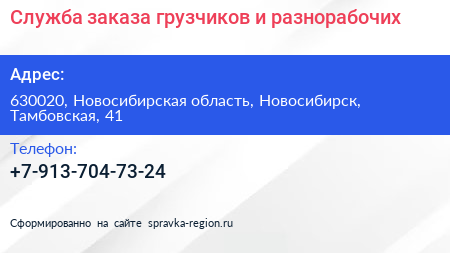 Служба заказа грузчиков и разнорабочих по адресу 630020, Новосибирская область, Новосибирск, Тамбовская, 41 в дальнейшем Организация, размещена в следующих категориях: