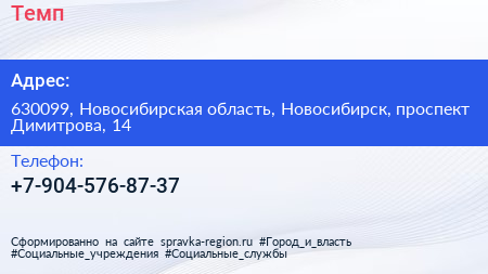 Темп по адресу 630099, Новосибирская область, Новосибирск, проспект Димитрова, 14 в дальнейшем Организация, размещена в следующих категориях: