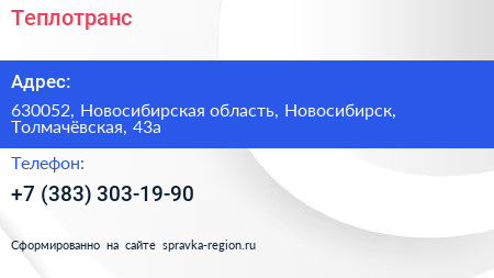 Теплотранс по адресу 630052, Новосибирская область, Новосибирск, Толмачёвская, 43а в дальнейшем Организация, размещена в следующих категориях: