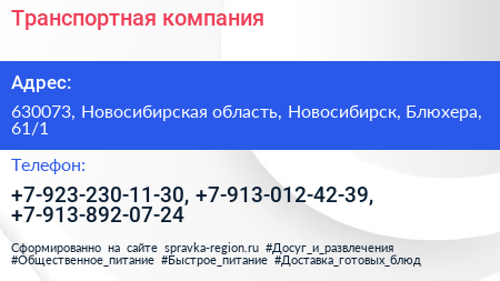 Транспортная компания по адресу 630073, Новосибирская область, Новосибирск, Блюхера, 61/1 в дальнейшем Организация, размещена в следующих категориях:
