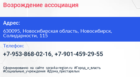 Возрождение, ассоциация по адресу 630095, Новосибирская область, Новосибирск, Солидарности, 115 в дальнейшем Организация, размещена в следующих категориях:
