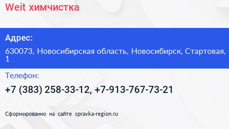Weit, химчистка по адресу 630073, Новосибирская область, Новосибирск, Стартовая, 1 в дальнейшем Организация, размещена в следующих категориях:
