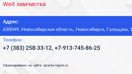 Weit, химчистка по адресу 630049, Новосибирская область, Новосибирск, Галущака, 1 в дальнейшем Организация, размещена в следующих категориях: