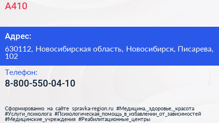 А410 по адресу 630112, Новосибирская область, Новосибирск, Писарева, 102 в дальнейшем Организация, размещена в следующих категориях: