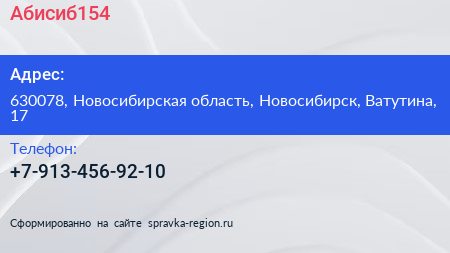 Абисиб154 по адресу 630078, Новосибирская область, Новосибирск, Ватутина, 17 в дальнейшем Организация, размещена в следующих категориях: