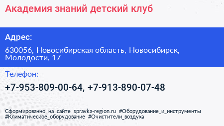 Академия знаний, детский клуб по адресу 630056, Новосибирская область, Новосибирск, Молодости, 17 в дальнейшем Организация, размещена в следующих категориях: