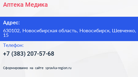 Аптека-Медика по адресу 630102, Новосибирская область, Новосибирск, Шевченко, 15 в дальнейшем Организация, размещена в следующих категориях: