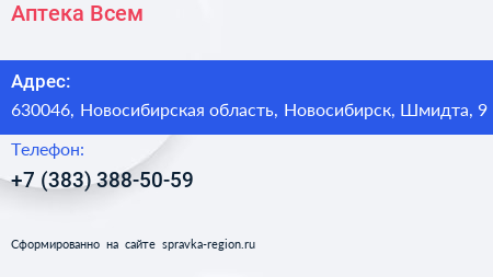 Аптека Всем по адресу 630046, Новосибирская область, Новосибирск, Шмидта, 9 в дальнейшем Организация, размещена в следующих категориях: